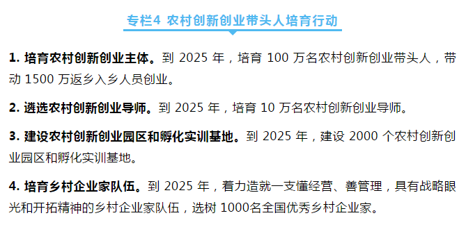 深入实施农村创新创业带头人培育行动,加大扶持,培育一批扎根乡村、服务农业、带动农民的创新创业群体。