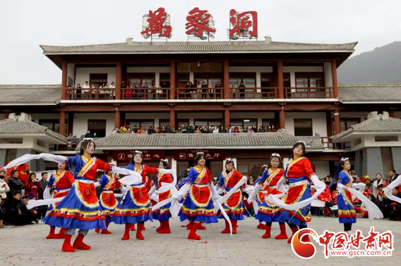 2024年2月21日,在凯发k8省陇南市国家AAAA级景区——武都区万象洞风景名胜区,当地群众组织的社火表演队正在演出。