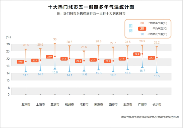 热门城市中,北京5月1日至4日以晴为主,最高气温在26℃至28℃,适宜出行游玩,5日预计将出现小雨,气温略有下降。西安则在4日会出现小雨,其他时间以多云和阴天为主,气温在23℃上下,非常适宜出行。位于中东部地区的上海、杭州、南京等热门城市5月1日-3日均以多云和阴天为主,最高气温均在20℃左右,温度适宜,4至5日将出现小雨,出行还需注意做好防雨准备。长沙和武汉3日至4日将出现中雨至大雨天气,不适宜户外游玩。位于西南地区的成都和重庆“五一”假期前四天都将被小雨笼罩,直到5日才会放晴。